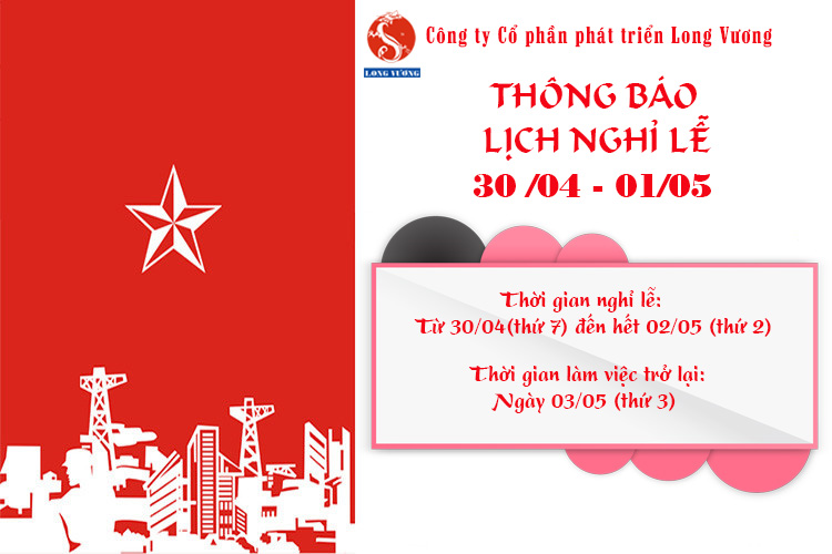 Công ty Cổ phần phát triển Long Vương trân trọng thông báo LỊCH NGHỈ LỄ 30/04 – 01/05/2022:
